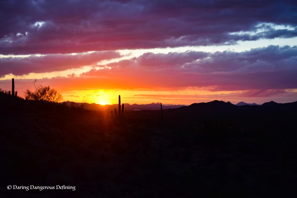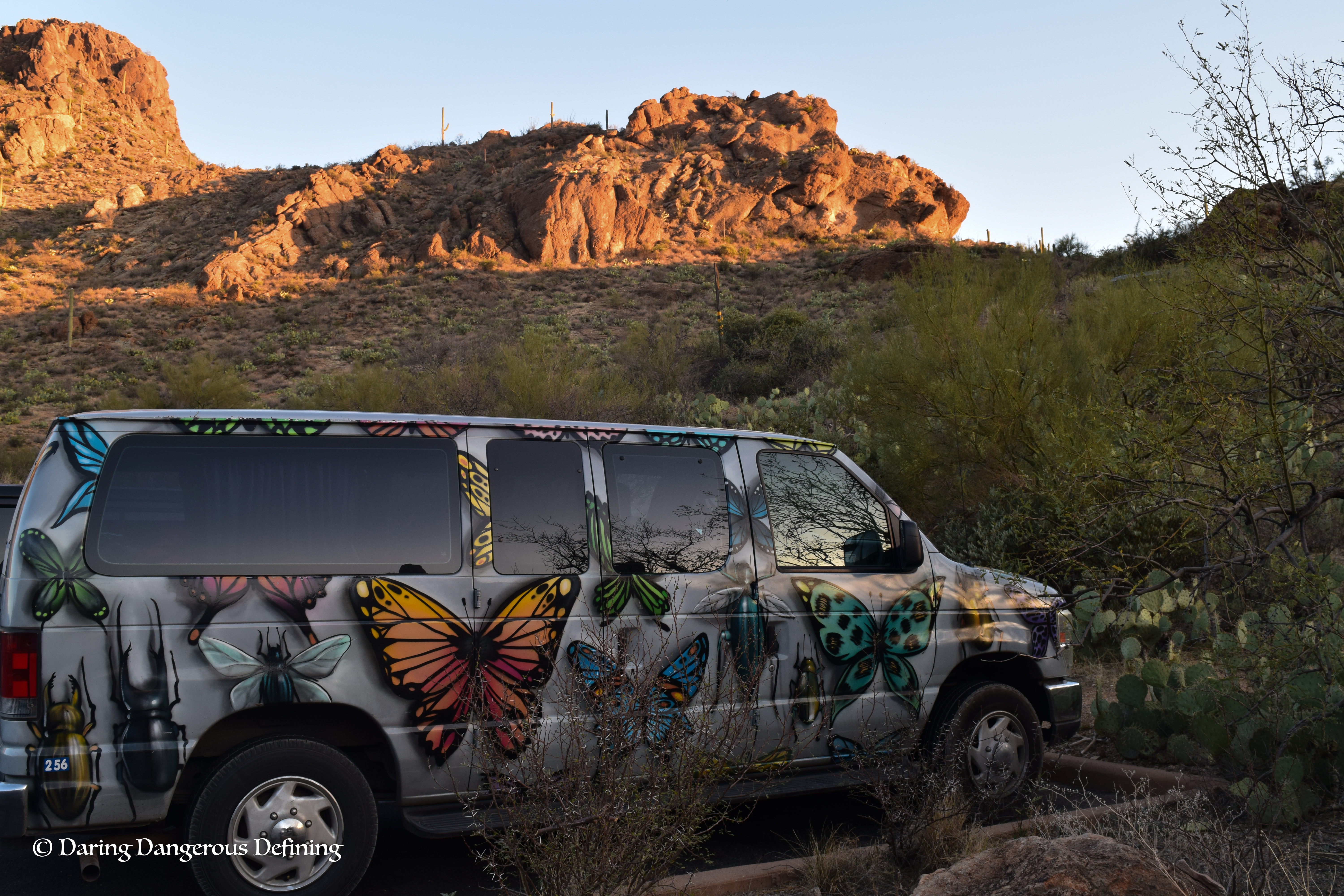 My mom and I decided that we were going to spend her spring break by exploring the National Parks in Arizona. After months of planning we were off and ready to head out west! We landed in Phoenix on March 25 in the evening and finally made it to a hotel (the first hotel that we went to didn’t have our reservation or any rooms despite our confirmation). The next morning we woke up early to go to pick up our Escape Campervan. If you are unfamiliar, Escape Campervan is a company that converts cargo vans into modified campers complete with mini cooler/fridge, coleman stove, and an area that converts into a bed which takes up most of the space in the car, they also have outrageous paint jobs. Once we beheld “Darwin,” or as I began calling it, the “Bug Mobile,” we got ourselves situated, picked up breakfast at In-and-Out Burger (a cheeseburger and fries for breakfast, which was really the only choice we could make!), and we were off to Tucson to go to our first stop, Saguaro National Park.