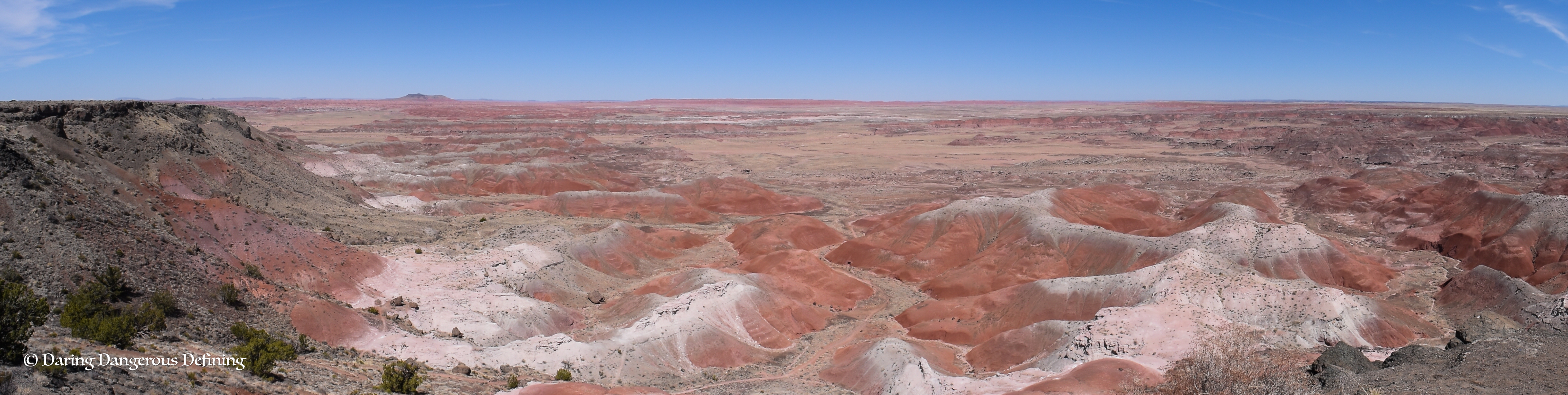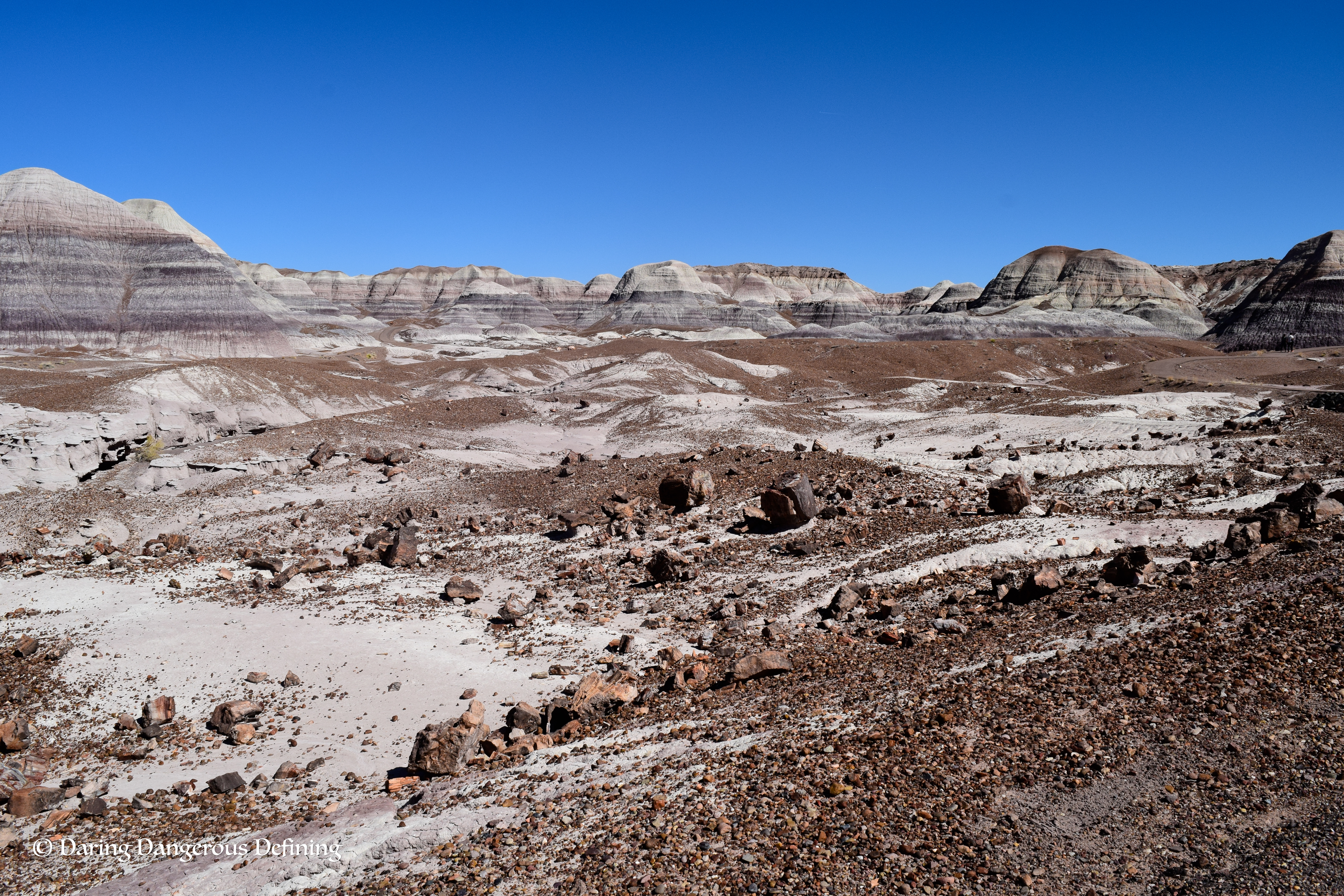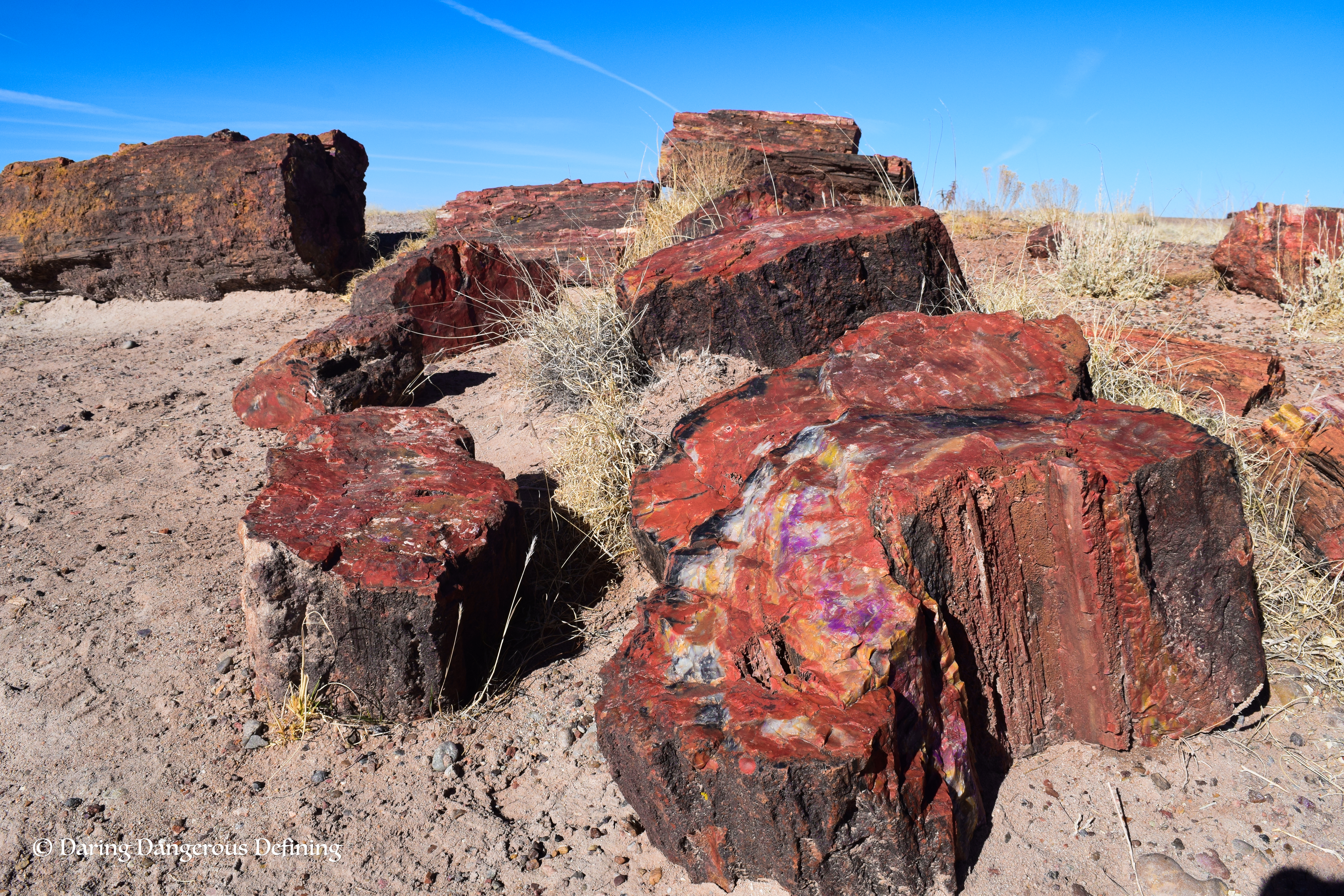 At the Painted Desert overlooks you can just sit and stare, the quiet of the desert below you and the wind rushing by. The idea of sitting for hours to take in the splendor of what’s before you, the red rock eroding into badlands and nothing but blue sky to the horizon, is not an absurd one. We rushed through some of the view points knowing that we’d be back to take everything in the next day when we could get to the park as early as it opened.