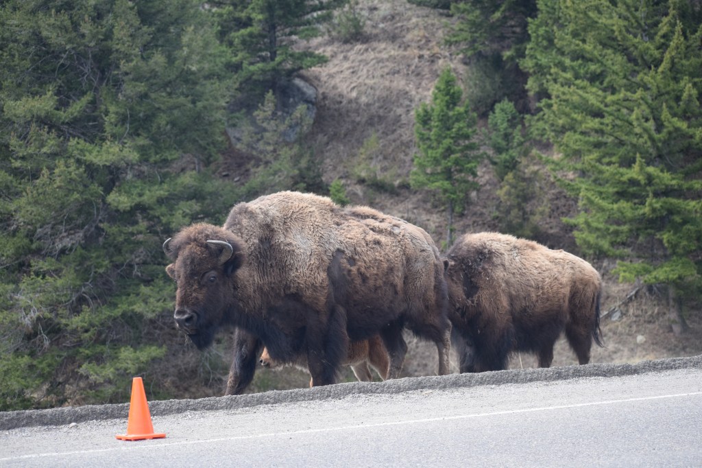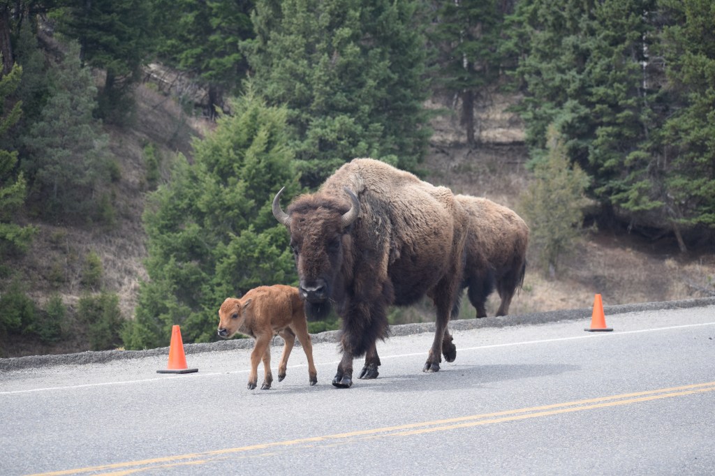 This early in the year, May, the park is still coming awake for the spring. This also meant tons of baby bison! They were adorable, little rust colored mini babies that definitely stood out in a crowd. Naturally I took my time viewing different herds and watching the calves interacting with the adult bison. I spent some time setting up my wildlife viewing scope for the first time and got to see grizzly bears very high on a mountainside on the way to Lamar Valley. I also got some pretty good shots of black bears on my first day into the park (I did stay elevated on a Boardwalk and there were many people for me to place in between me and the bears – obviously I’m kidding, that’s why I carry bear spray).