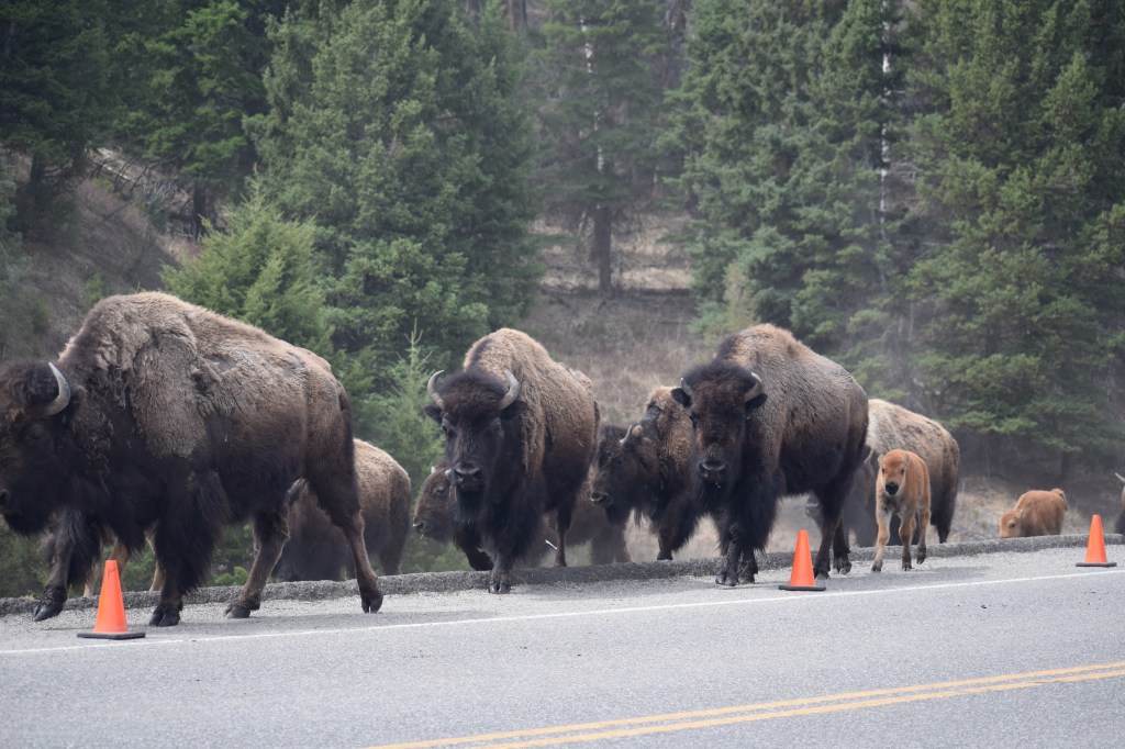 My second day was also spent with a lot of wildlife viewing since I was still in the northern section of the park. When crossing a bridge I noticed there were many cars pulled to the sides in pullouts and there were also two National Park Service vehicles pulled over and rangers were out speaking with visitors at the pull out – who wouldn’t stop with such a temptation? There was a black bear down near the waters edge of the river. Visitors were on the bridge/roadway looking down to the river to see the bear and watch as it foraged. While we were all looking at this bear, here comes another herd of bison. This encounter was a little more stressful as the Park Rangers stopped additional traffic due to the volume of the herd and their speed as they stampeded towards the bridge. The rangers had all of the visitors gather together and we moved as one to get out of the range of the quickly moving bison. I’m not sure how scientific it is, but perhaps it was a move made from experience, but the rangers said it was better if we were in a larger group so the bison wouldn’t feel threatened and would pass us by – I’m not why why a large group is less intimidating than a person alone, but I was a sheep and I followed suit!