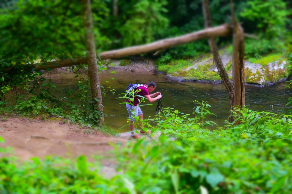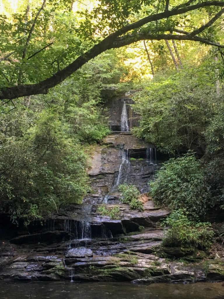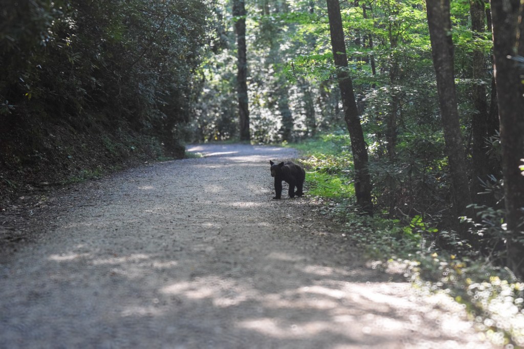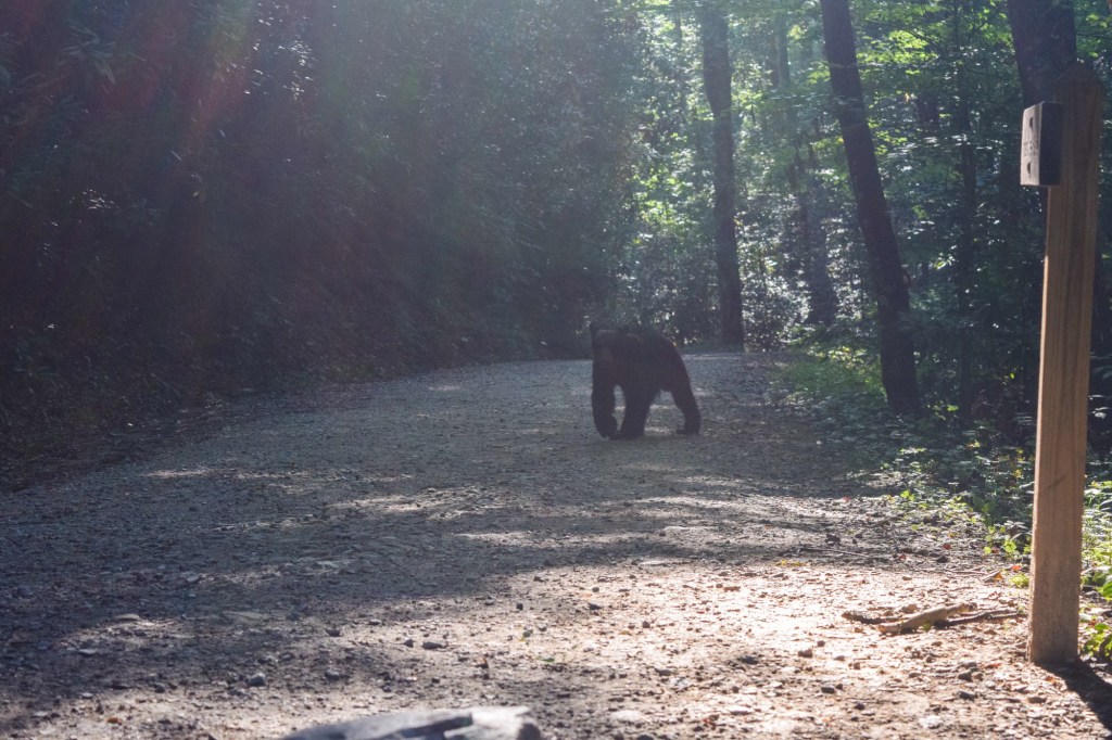 We started on the Juney Whank trail which takes hikers to a waterfall. We continued on the hike through the wooded area until we magically made our way over a bridge back to the main trail that all the tubers were going on. We started walking to the Indian Creek falls when other hikers came back down the trail speaking very loudly and announcing there was a bear on the trail. Well, idiots that Sam and I are, we wanted to see that bear and couldn’t be bothered to heed warnings. We hiked maybe a few dozen yards and then saw, lumbering down the trail, a small adult American Black Bear. It was just moseying along without a care in the world, and it was walking our direction. I pulled Sam down a side path out of the bear’s way so we could still see the animal, but also to make sure we were at least a little bit safer. The bear passed where we were standing and down the path and then was out of sight. We walked to the waterfall and from our perch saw the bear again on the other side of the river without any idea of when it had crossed further downstream and then made it’s way across from where we were standing. After that excitement we finished our hike and went to make camp dinner!