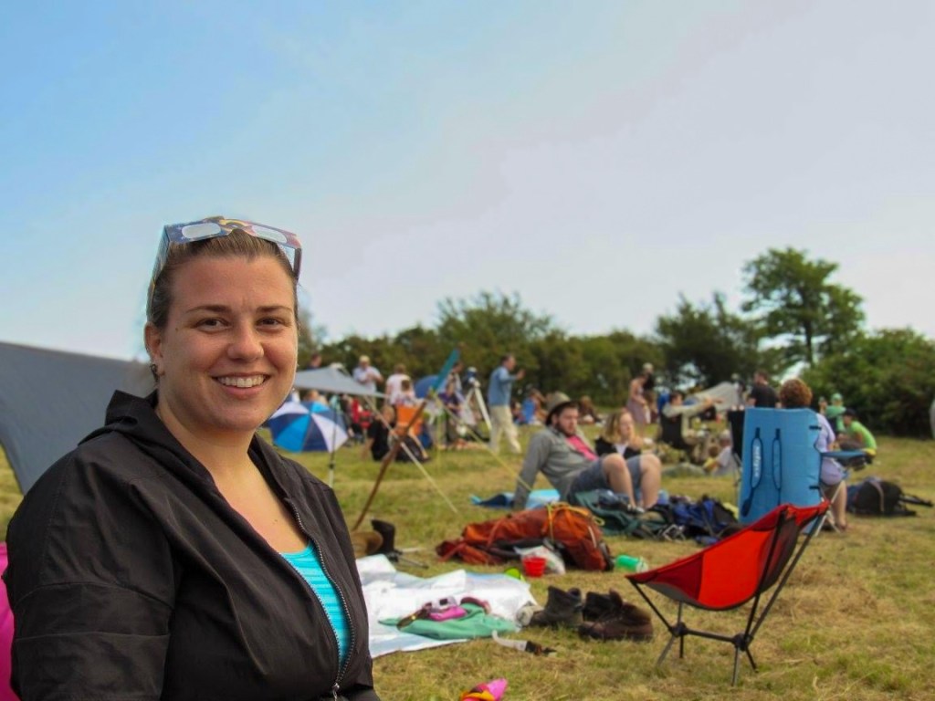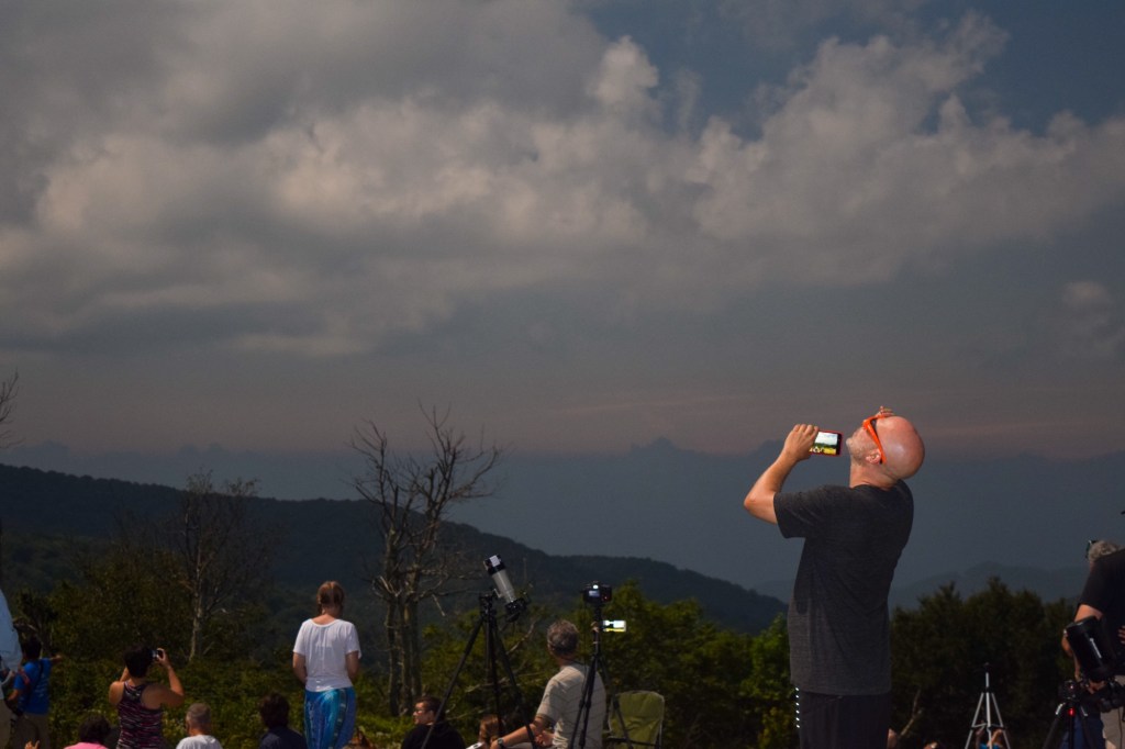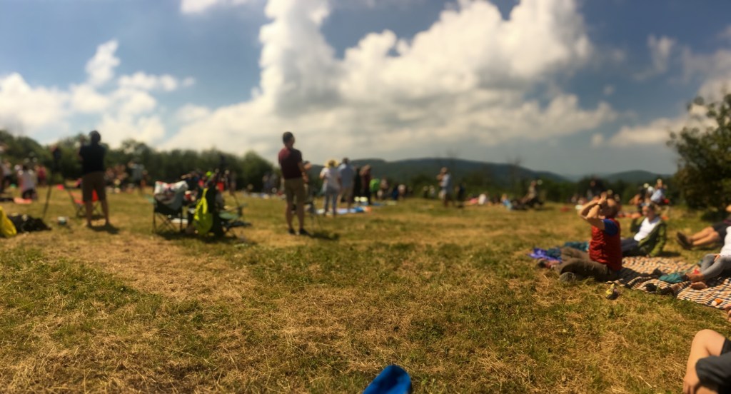 Once we got to the bald area we walked around for a while to find the perfect spot. We walked over near another family who had camped at the bald overnight to secure their location. As the day wore on, more and more visitors arrived. Many were like us, clearly hikers and here to see something cool, families with children arrived, couples, friends, solo visitors, but then there were others who arrived who I felt like were there to put on a show and I wasn’t mad about it! There were groups who arrived who were there to not only see a cool event like we were, but who were there to commune with nature. One group who arrived had a couple who were seemingly contortionists (at least that’s what their yoga moves looked like to me) and another group was sitting in a circle and chanting. The eclipse brought out people of all different backgrounds and practices. And at that point we all sat to enjoy together. As the time neared for totality there was a lot of cloud cover (I mean, we were still basically in the Smoky Mountains – it’s in the name). Sam asked if I wanted to leave our spot to try to find somewhere with less cloud cover, but we could see the roadway in the distance and it was in gridlock, so I told him we would just have to wait and hope for the best because what would end up happening was we would be stuck in the car when totality happened and we would miss it if we left our spot.