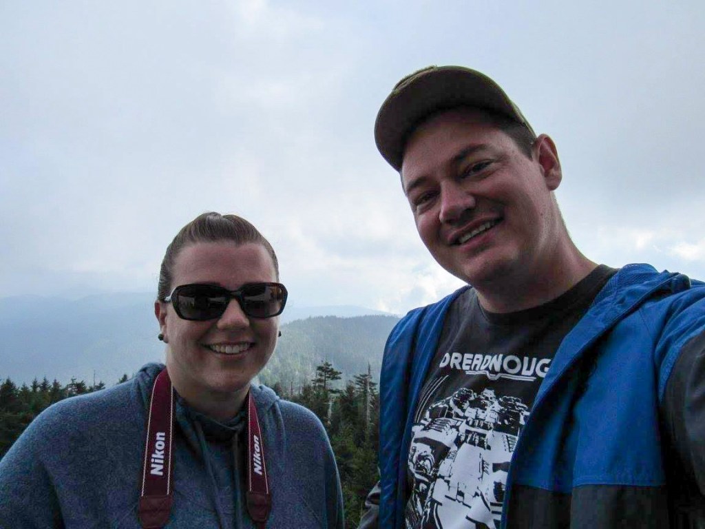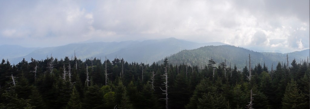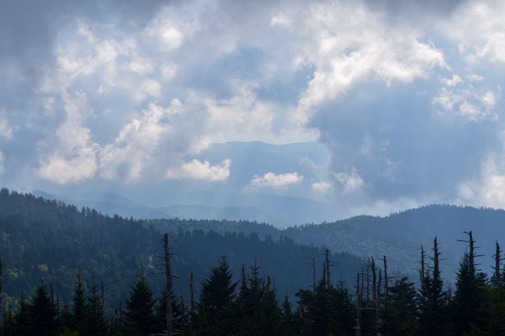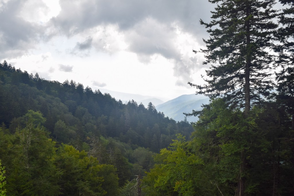 The next morning we packed up camp because it was time for us to head home. But I wasn’t ready to leave yet, despite being in the park for 2 nights we really hadn’t seen much of it, so we decided to drive up to Clingman’s Dome, the highest point in the Great Smoky Mountains National Park, so we could say we’d seen it. We hiked up to the spiral viewpoint structure at the summit (and yikes that is a steep hike). We saw panoramic vistas of the park and surrounding area and even took a side trail to very briefly walk along the Appalachian Trail that passes next to the Clingman’s Dome. Then it was time for us to leave the park to start the 10 hour drive home. Of course, we stopped at a few turnouts on the way out!